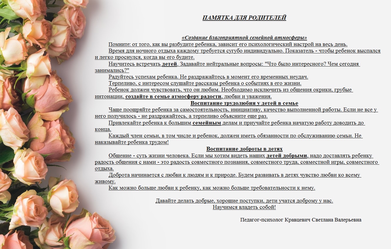 | 4 | Памятка для родителей Благоприятная семейная атмосфера | DOCX |